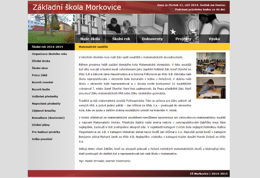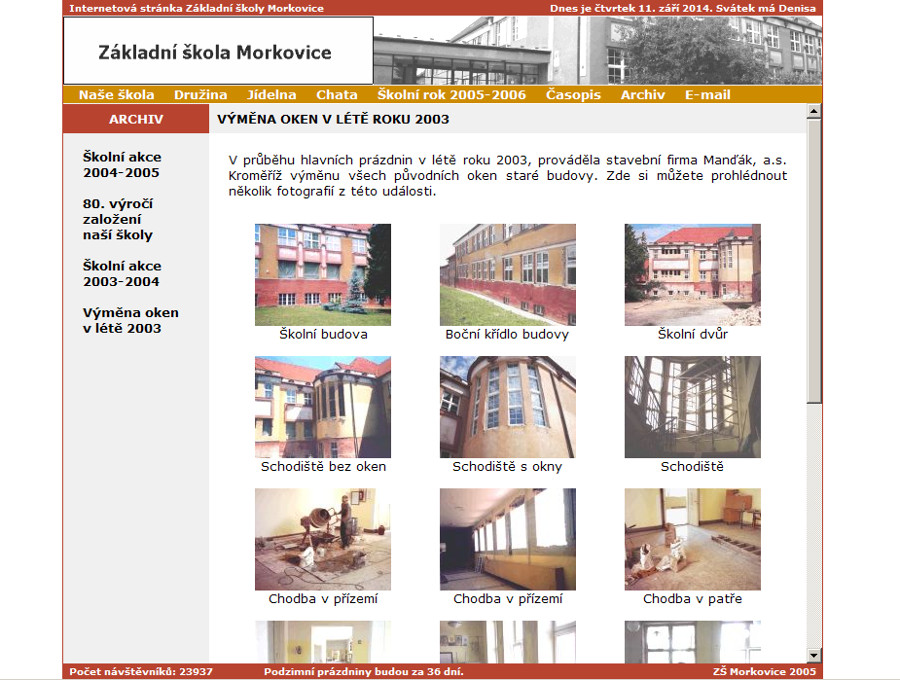 Na níže uvedených snímcích můžete vidět postupnou proměnu, kterou naše internetová stránka v průběhu uplynulých let prošla. První fotografie ukazuje vůbec první verzi naší internetové stránky, kterou jsme měli umístěnu u společnosti WorldOnLine - poskytovatele internetového připojení, později známého pod názvem Tiscali.cz. Modré tóny barev zůstaly zachovány i ve druhé verzi internetové stránky z roku 2003. V roce 2004 přišla opět změna grafického ztvárnění stránky. Tentokrát byly zvoleny barvy blízké barvám fasády staré budovy naší školy. Dominantní se staly barvy v odstínech červené a tmavě žluté a tato barevná kombinace setrvala na internetové stránce školy až do roku 2014. V pořadí čtvrtá verze internetové stránky z roku 2006 je zajímavá především tím, že na pozadí využívá JavaScript a PHP. Aktualizace stránky se stala pohodlnější, což se pozitivně projevilo v aktuálnosti zveřejňovaných informací. Pátá verze naší stránky pochází z roku 2008. Šestá podoba naší internetové stránky pochází z roku 2009. V pořadí sedmý grafický návrh pocházel ze srpna roku 2014 a je prozatím rekordní v tom, že byl využíván plných sedm let až do roku 2021. Stránka dostala pestré barvy a stala se tak určitě veselejší.