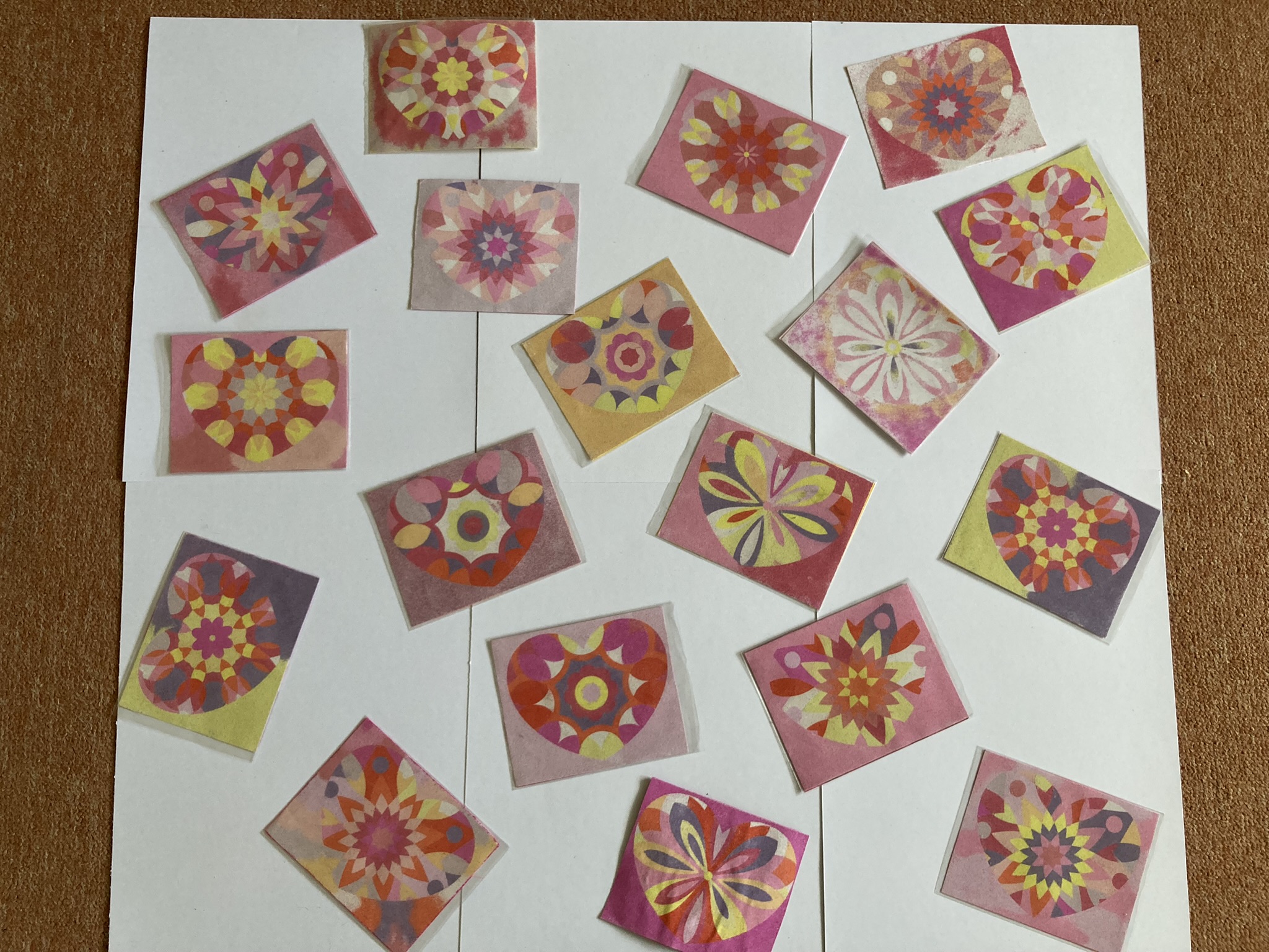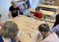 Minulý týden jsme ve třídě tvořili srdíčková přáníčka pro maminky. Srdíčka jsme zdobili tak, že jsme odlepovali části samolepící pásky, a pak jsme na lepící plochy sypali barevný písek. Říká se tomu pískování. Nakonec jsme si vybrali na internetu krátkou básničku a tu jsme opsali bez chyb (ne všichni:))) na srdíčko zezadu. Každé srdíčko bylo jiné a krásné! Práce nás moc bavila.