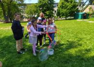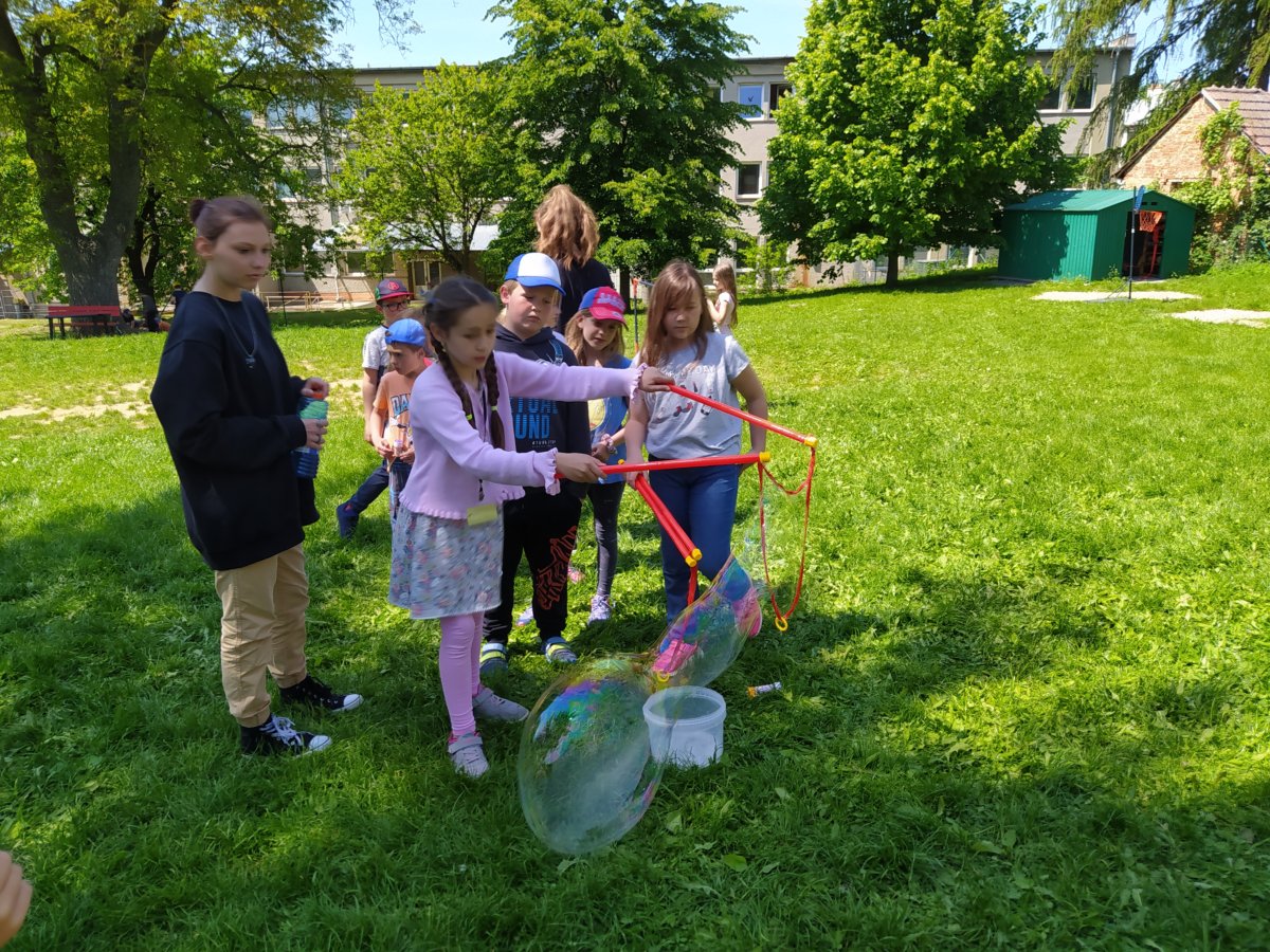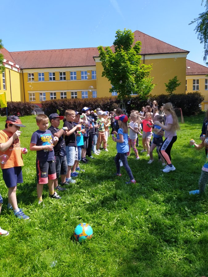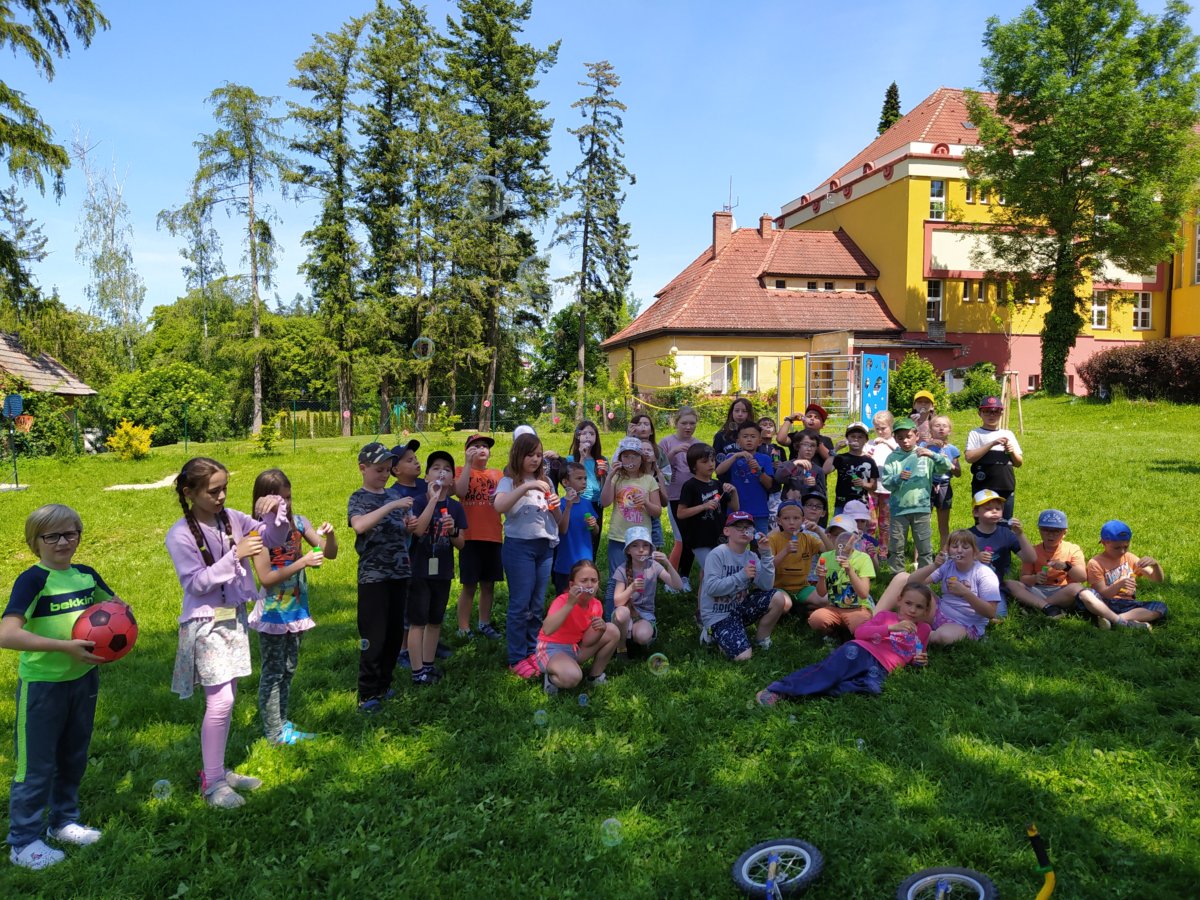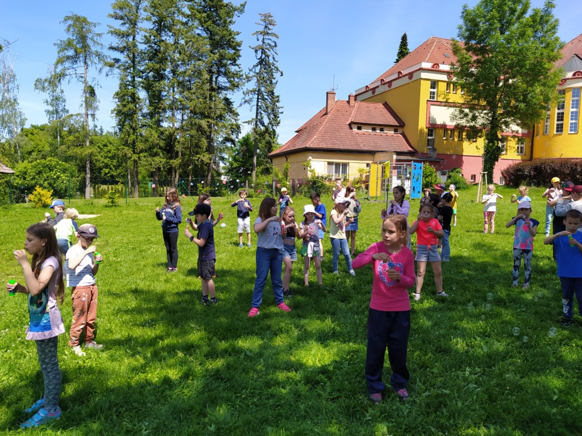 Ke Dni dětí jsme uspořádali několik společných akcí. Posledního května, za krásného počasí, proběhly Hrátky s bublifukem. Děti zkoušely vyfouknout co nejvíce bublin a soutěžily, kdo vytvoří největší bublinu. Další dny jsme čekali na vhodné počasí, abychom mohli uskutečnit Sportovní odpoledne na zahrádce. Cílem této akce bylo vyzkoušet i netradiční sportovní dovednosti na deseti stanovištích. Nejvíce zaujaly stanoviště s vodou, kde děti měly proudem vody sestřelit plechovky nebo posunout kelímek zavěšený na provázku. Následující den jsme za odměnu opékali špekáčky a tím doplňovali energii. Všem moc chutnalo.
