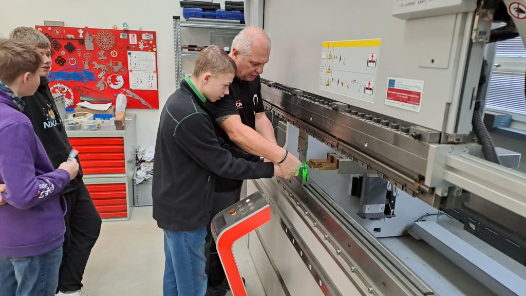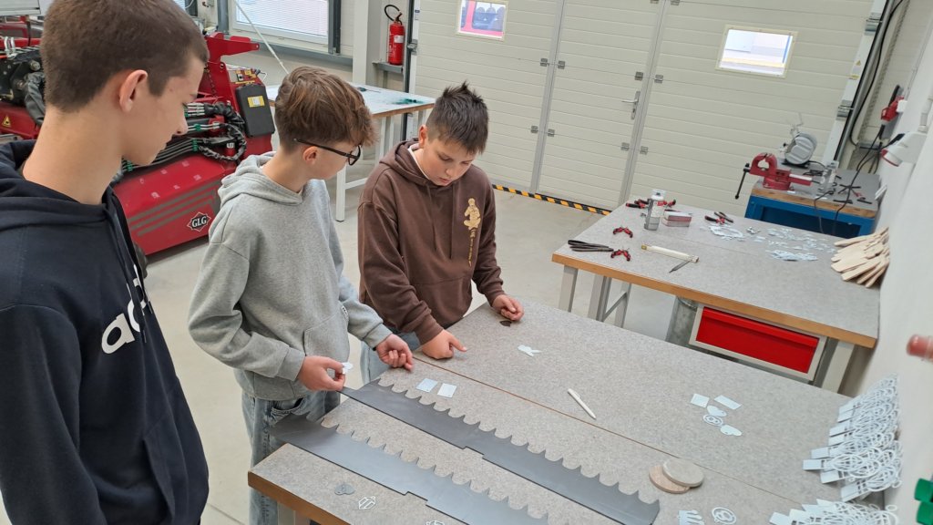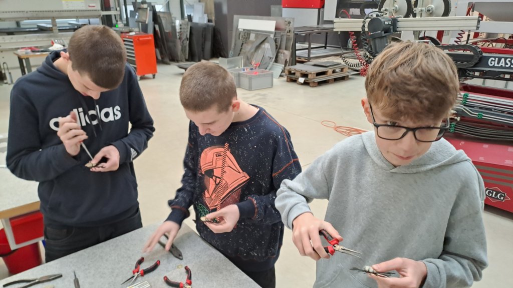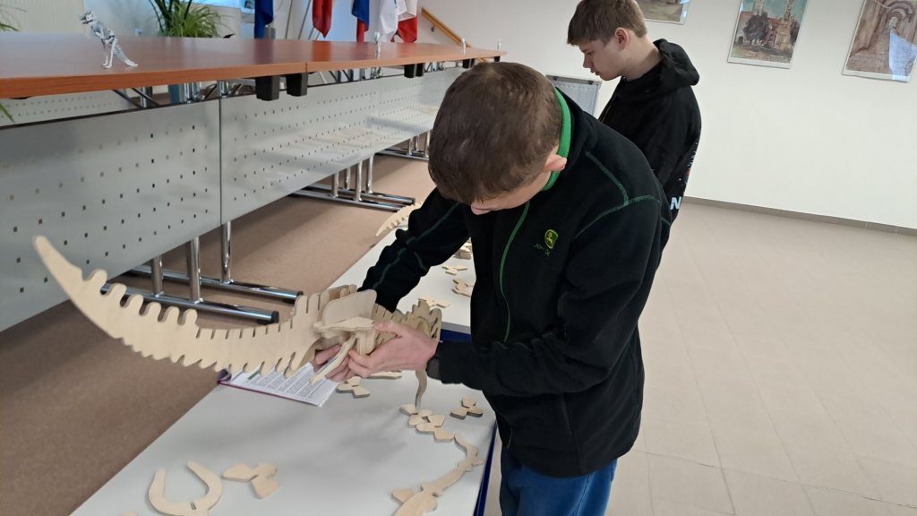 Měli jsme možnost sledovat při práci laserový řezací stroj, který nám podle námi připravených programů vyrobil malé kovové přívěsky na klíče. Dokonce si někteří z nás mohli tento obrovský stroj i chvíli ovládat. Vyzkoušeli jsme si práci s ohraňovacím lisem, vytvořili jsme si výkres dalšího výrobku a naši prostorovou představivost jsme prověřili při skládání 3D modelu pravěkého ještěra. Všichni jsme si nakonec odnesli i malého plechového raka, kterého jsme vybavili drobným kamínkem a upravili mu nožičky.