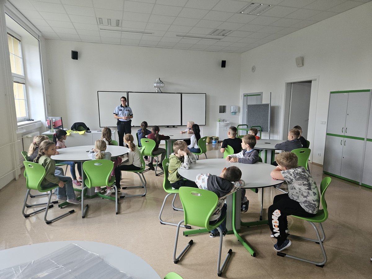 V pondělí 29. září 2025 navštívila naše druháky uniformovaná paní policistka s programem Policista je náš kamarád. Dětem představila práci pořádkového policisty, seznámila je s policejní výzbrojí a výstrojí, ukázala jim, jaká zvířata i dopravní prostředky policie využívá. Nechyběla ani doporučení, jak se chovat při setkání s cizí osobou.