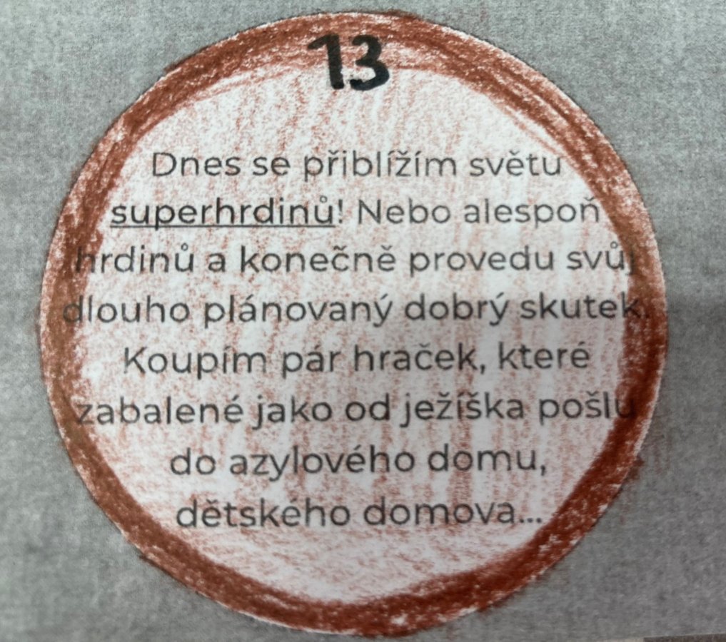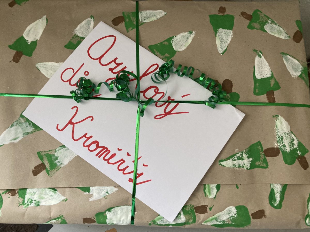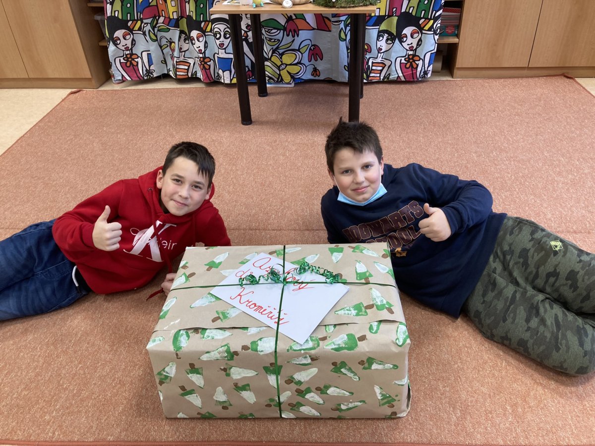 Je adventní čas a my plníme každý den úkoly z adventního kalendáře. Většinou se týkají nás samotných, ale v pondělí 13. 12. zněl úkol jasně: Nemyslet jen na sebe, ale i na ty děti, které na tom nejsou tak dobře jako my! Proto jsme opravdu všichni přinesli hodnotné hračky a knížky, které jsme dali do velké krabice, vyrobili svůj balicí papír a napsali přání. Museli jsme počkat do odpoledne, než uschnou barvy na našem balicím papíru, a tak balík dokončili jen naši určení spolužáci. Dílo se povedlo a p. uč. R. Zdražilová odvezla naše dárky do Azylového domu v Kroměříži! Tak ať udělají někomu radost! Přejeme krásné Vánoce:)