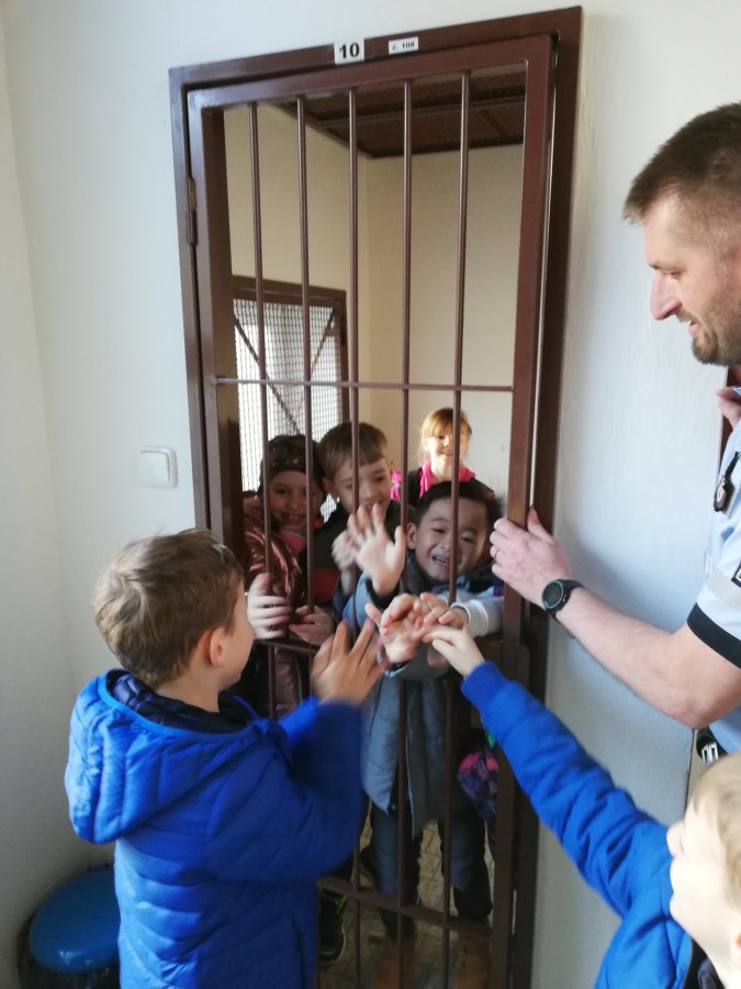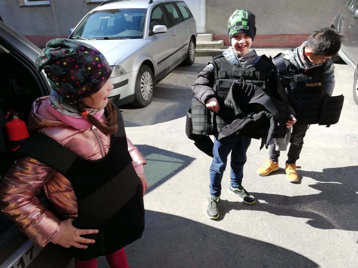 V úterý 12. dubna 2022 jsme se vydali za tatínkem naší spolužačky Terezky, který pracuje u Policie v Morkovicích. Provedl nás po budově místní stanice, ukázal její vybavení – počítače, kamery…, nakoukli jsme do cely pro nezbedné spoluobčany, prozkoumali policejní auto a spustili i majáky s houkačkou. Nakonec jsme si vyzkoušeli policejní čepice a neprůstřelné bezpečnostní vesty, které jsou pořádně těžké.