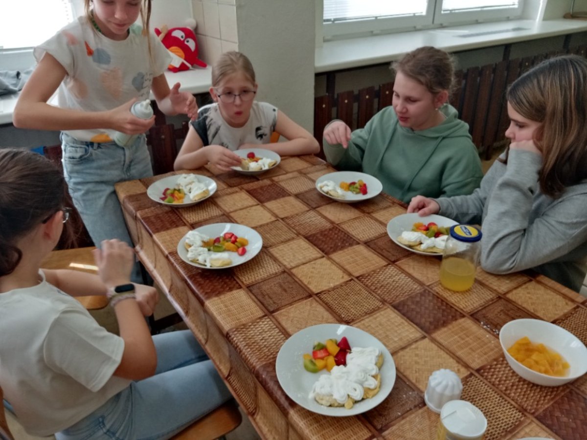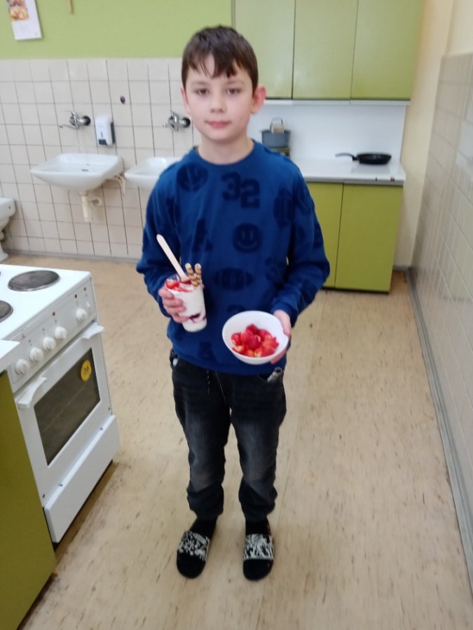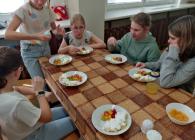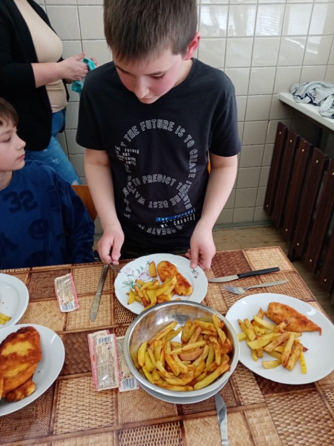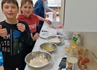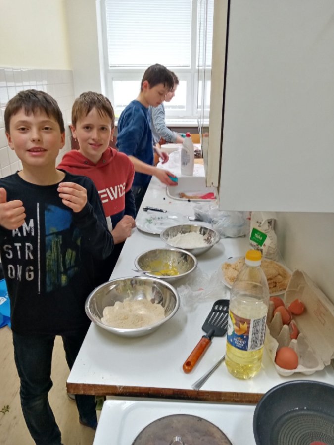 V hodině pracovních činností se žáci 5.B rozdělili do tří skupin. Na internetu si společně vyhledali recept, podle kterého si připravili daný pokrm. Domluvili se na tom, jaké suroviny každý z nich přinese. Vybrali si z pokrmů kuřecí řízek a hranolky, pizza a lívance. Všem se jídlo podařilo zdárně připravit a odměnou jim byl chutný oběd.