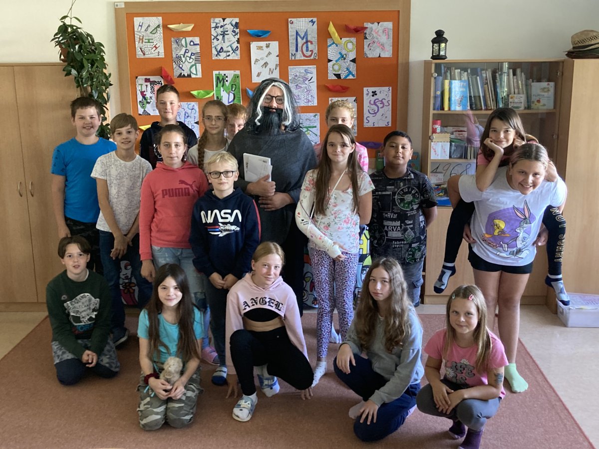 Je středa 26. 9. Zvoní na poslední vyučovací hodinu, chystáme se číst zajímavý článek v čítance, když někdo ťuká na dveře. “Dále, vstupte,” říká paní učitelka. A co to, do dveří vchází vzácná návštěva – sám Jan Amos Komenský. My už o něm hodně víme, učili jsme se o něm ve vlastivědě: četli jsme různé zajímavosti, vyráběli lapbooky, zhlédli kreslené filmy, ale toto je překvapení!
