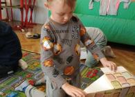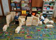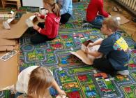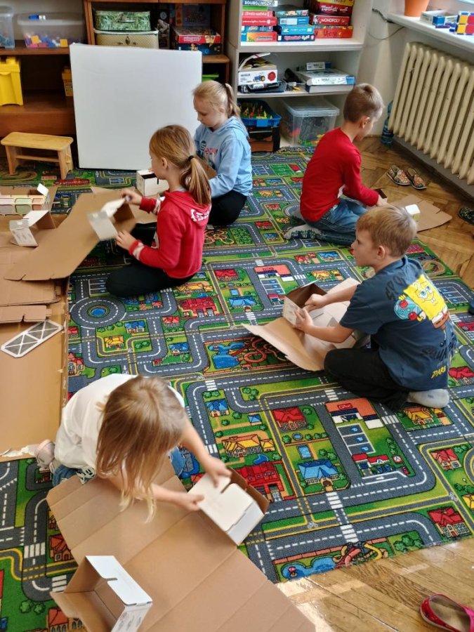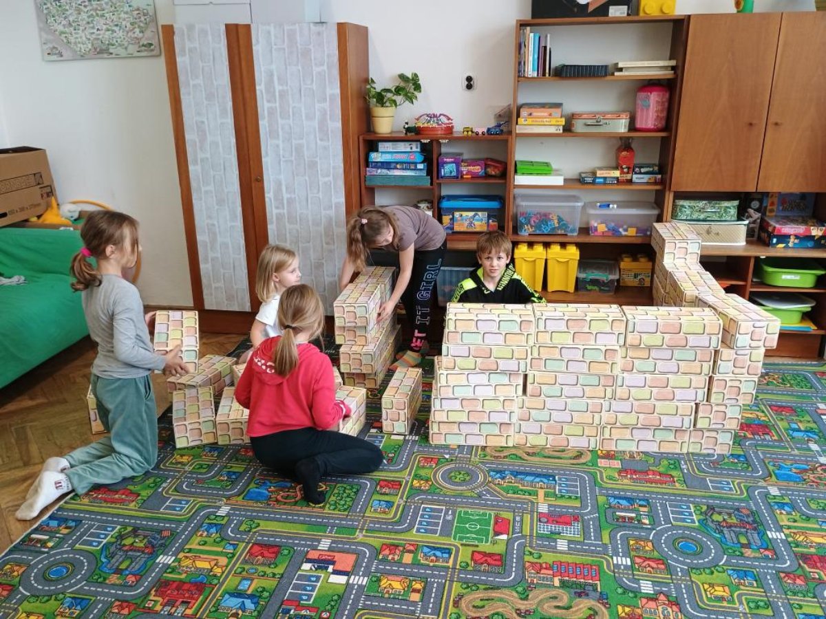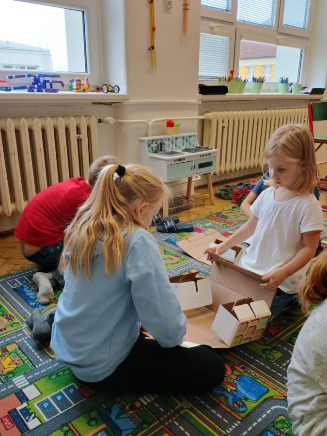 Co to je? Chvíle napětí... a HURÁ!!! Jsou to nové obří kostky. Hned po otevření krabice, si děti věděly rady a začaly sestavovat cihličky. Když byl stavební materiál hotov, z dětí se staly stavitelé a s nadšením se pustily do práce. Postavily si stěny domečku, kde mají svůj soukromý prostor.